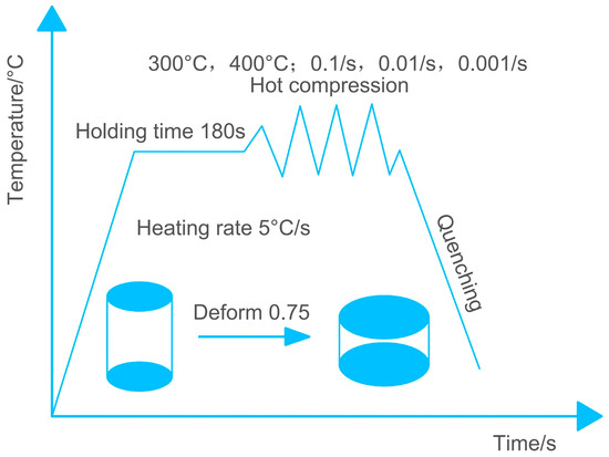 The compression test at elevated temperatures was conducted to explore the deformation response of the alloy. Detailed compression processes are displayed in Figure 2. The experiments were conducted using a Gleeble-3800 thermal simulation machine (DSI, St. Paul, MN, USA). The heating rate was 5 °C/s, compression temperatures were 300 and 400 °C, and strain rates were 0.001 s−1, 0.01 s−1, and 0.1 s−1. Once the target temperature was achieved, the test samples were held for 180 s. True strain was selected as 0.75, and the cooling method used after compression was water quenching. For each test condition, three valid experiments were conducted.