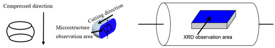 The microstructure and XRD observation area of the sample are shown in Figure 3. Microstructure characterization surfaces were cut from the deformed samples. A mirror surface can be obtained via grinding and polishing. Subsequently, the surfaces were electrolytically etched to obtain the microstructure’s characteristics. The etching solution comprised water and HBF4 (5% by volume) (Runfeng Petrochemical Co., Ltd., Nantong, China). The etching parameters were set at 20 V, and etching was carried out from 2 to 4 min. Moreover, microstructure characterization was carried out using an optical microscope. For TEM characterization, slices with a thickness of 0.5 mm were machined via wire electrical discharge. Subsequently, the slice was reduced to 70 μm. Then, the slice was thinned and perforated via double spraying. The microstructures were characterized using Talos F200X (FEI, Hillsboro, OR, USA). An X-ray diffractometer (BRUKER, Billerica, MA, USA) was used to test and analyze the texture. The observation surface was ground and polished, and the pole figures of (111), (200), (220), and (311) were tested. The initial microstructures of the 7075 aluminum alloy are displayed in Figure 4. The extruded 7075 aluminum alloy bar consisted of elongated grains, and a certain number of dislocations and precipitates were observed.