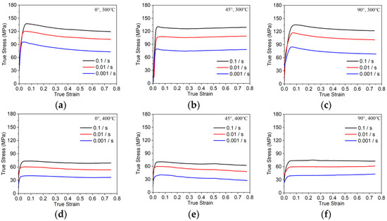 True stress–strain curves of 7075 alloy bar with different compression conditions: (a) 0°, 300 °C; (b) 45°, 300 °C; (c) 90°, 300 °C; (d) 0°, 400 °C; (e) 45°, 400 °C; (f) 90°, 400 °C.