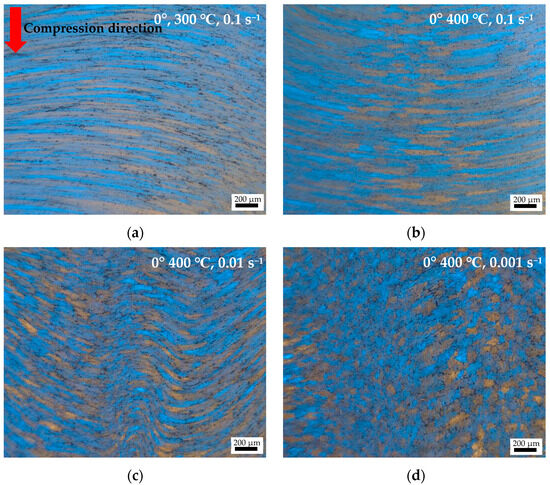 OM of 7075 alloys compressed using different conditions: (a) 0°, 300 °C, 0.1 s−1; (b) 0°, 400 °C, 0.1 s−1; (c) 0°, 400 °C, 0.01 s−1; (d) 0°, 400 °C, 0.001 s−1.