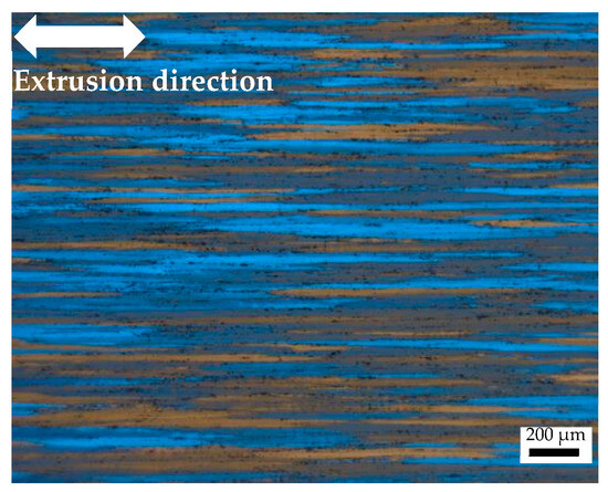 During deformation, many factors result in alloys exhibiting anisotropic mechanical properties regarding their grain shape, texture, particle distribution, and chemical composition distribution. In this work, grain shape and texture are mainly discussed. Figure 8 displays the grain structure of the extruded 7075 aluminum alloy. Most grains are elongated towards the extrusion direction. The grain boundaries of the 7075 alloy are clear. The width of the grains is within the range of 30–40 µm. Preliminary studies prove that elongated grains cause alloys to exhibit anisotropic mechanical properties [35]. Yang [36] conducted a hot compression test of an Al-Zn-Mg-Cu alloy at a temperature range from 320 to 340 °C. The alloy with elongated grains exhibited anisotropic compression responses. The experimental data imply that the specimens along the extrusion direction exhibit the maximum strength; meanwhile, the strength of the 90° specimen is the lowest. Qiu [31] investigated the response of a 6082 alloy processed via extrusion, and it was reported that the specimens along the extrusion direction have the highest stress level. This can be attributed to the elongated grains that formed during extrusion.