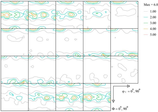XRD-derived ODF sections of macrotextures measured in the extruded 7075 aluminum alloy bar.