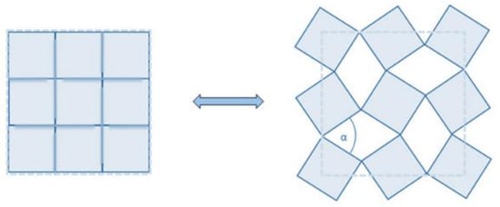 In this study, the geometry that characterizes the kirigami-based material is based on the “rotating-square mechanism”. The rotating-square mechanism is a single-degree-of-freedom mechanism exhibiting an auxetic behavior. In this structure, rigid squares are connected at nodes through simple hinges. Under an external load, the squares start rotating at the vertices, expanding or contracting in the orthogonal direction with respect to the load depending on the loading type and starting condition, if open or closed (Figure 1). The first researchers to explore this kind of material were Grima et al. [].
