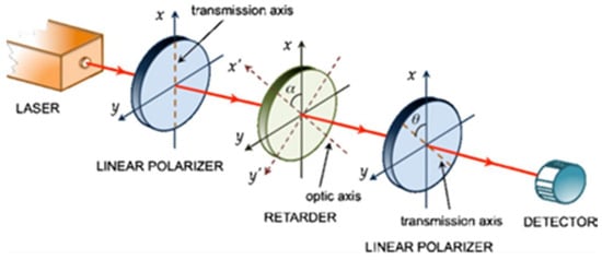 Birefringence was discovered in 1669 by Erasmus Bartholinus (1625–1698) using calcite []. Birefringence is a synonym of double refraction. Refraction is the phenomenon where the direction of a wave is altered as it moves from one medium to another, caused by its change in speed. This phenomenon occurs in all the waves present in nature, and it is controlled by a parameter named the refraction index. Refraction occurs if two objects have two different refraction index values. Birefringence occurs in anisotropic elements. In Figure 2, an experimental setup made up of a light source, two linear polarizers, and a “retarder” between the two linear polarizers is shown []. A retarder is an optical device that modifies the polarization state of a light wave as it passes through. It is typically constructed using a birefringent material, which has different refractive index values for light polarized along two specific perpendicular crystal axes. When light passes through the retarder, its polarization state is altered based on the differential phase delay experienced by the two perpendicular polarization components. This modification can be used for various applications, such as controlling the polarization of light or creating optical effects []. The incident light that comes out from the first polarizer changes the phase angle according to Equation (2). Birefringence can be used to produce the desired phase angle to obtain some new results that could be based on deviation or on a lower wavelength as an output.