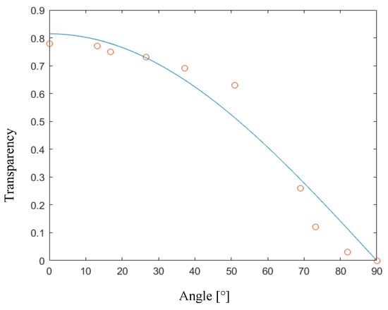 A polarizer can be seen as a black box with a specific transfer function that allows only a specific light to pass through it []. If another layer of polarizer is put on top of the first one, in the case of linear polarizers, one specific direction of polarization can be observed. The direction of the electric field that can cross the polarizer is the main direction of polarization. The angle between the two sheets determines how much light can pass through the polarizer; the output will be a reduction in the light intensity. If polarizers are aligned, the output will be transparent. If they are crossed, no light will cross, and the output will be opaque. So, by rotating a polarizer and fixing the other one, it is possible to reach a variable transparency. A characterization consists in evaluating how much light passes a specific position of the two polarizers at specific angles. A MatLab code was developed for characterizing polarizers based on Jones matrices, and its results were compared with experimental ones. From the experimental side, the characterization consisted of the following steps: record a movie while rotating the polarizers from 0° to 90°, import the recorded movie in MatLab, and track the recorded movie with a script. The designed script captured a single video frame and took the color of the polarizers’ overlapped area in RGB scale (red, green, blue scale: a scale that describes all colors through a digital mixing of the three main colors). The script converted the color in RGB to greyscale (a scale based on the intensity of the grey) with the function “RGBtoGreyscale”; in this way, it is easy to obtain the intensity of light as an output. Then, the transparency value was computed (Equation (1)) in comparison to the total opaque value: