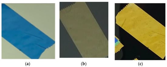 The output obtained by the setup shown in Figure 2 was a vivid color that came out from the tape. The colors shown in Figure 4a were obtained by orienting at 0° the main polarization direction of the two polarizers and using only one layer of tape. When one of the two polarizers was rotated 45° and 90°, the color changed from blue to light yellow to gold yellow (visible in Figure 4b,c). By adding more layers of tape at different angles, more colors could be reached. A good result was obtained with two layers of tape, where a color change was clearly visible, but with three layers of tape, the obtained results were really interesting. A color database (Table 1) was built by using three layers of tape and rotating the movable polarizer up to 180°. Three different setups were assembled, and colors were captured frame by frame in RGB (red, green, blue digital scale) with MatLab code. The setups used were composed of three layers of tape mounted with the following angles: first setup: 0°, 20°, 45°; second setup: 0°, 35°, 80°; third setup: 100°, 130°, 190°.
