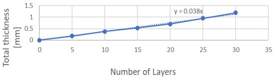 The first step was to consider all the setups shown in Table 1. Each of these setups can be considered as a black box with an input. There is a wavelength that is dominating and that is producing a color output. The goal was to find it. The key step was to find the normalized output after determining the birefringence index. The birefringence index (Δn) was evaluated from the inverse formula of phase shift γ (Equation (2)) for a fixed wavelength []. The tape thickness was measured by assembling several lay-ups made up of 5, 10, 15, 20, and 25 layers of tape and measuring each lay-up five times. The searched thickness was the slope of the line in Figure 5: 0.038 mm. Then, the birefringence index was computed through an iteration, and it was equal to 0.0077. The mathematical model was qualitatively validated, as shown in Figure 6, by comparing its results with experimental data found in literature []. The graphs show the trend of the light intensity with respect to the cosine of the angle between the polarizers for different tape orientations. Note that the output of the MatLab model was normalized, differently from the model developed in [] which provided an intensity of light module as an output.