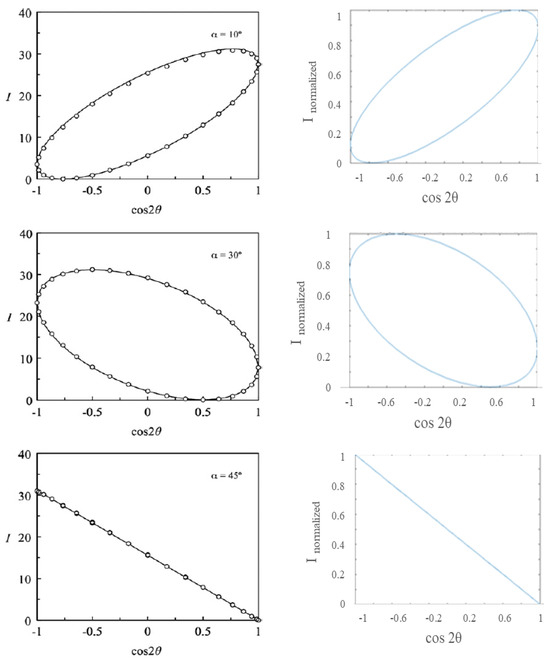 Validation of the mathematical model: intensity of light vs. cosine of the angle between polarizers. Left column: results from []. Right column: output obtained from the developed mathematical model for different orientations of tape (10°, 30°, 45°).