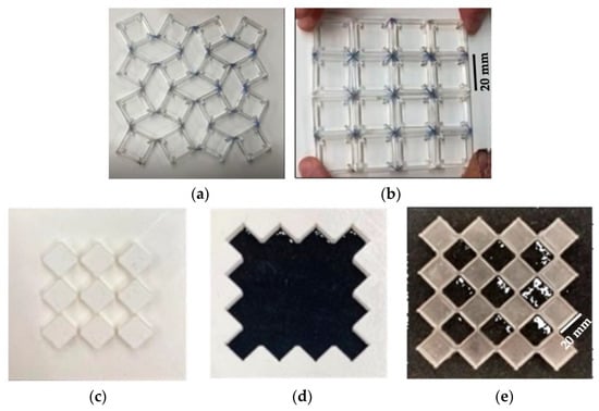 Final assembly of acrylic rotating square 10 mm thick: open (a) and closed (b) position; PDMS rotating squares 10 mm thick: 3D-printed mold parts (c,d) and demolded structure (e).