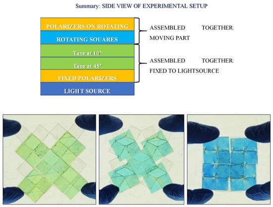 In the developed experiments, the role of the retarder was played by common cellophane tape. Cellotape exhibits birefringence due to its manufacturing process. When cellophane is stretched during production, the organic molecules within it align and straighten in the direction of the stretch. This alignment causes a difference in the dielectric constant and subsequently the refractive index along the direction of the tape compared to the perpendicular direction. These two directions serve as principal axes, and as a result, the polarization components parallel and perpendicular to the length of the tape travel at different velocities. This differential velocity leads to the phenomenon of birefringence in cellotape [,,]. The cellotape was placed between two polarizers and illuminated with a light source of a given temperature (5000 K) on the background.