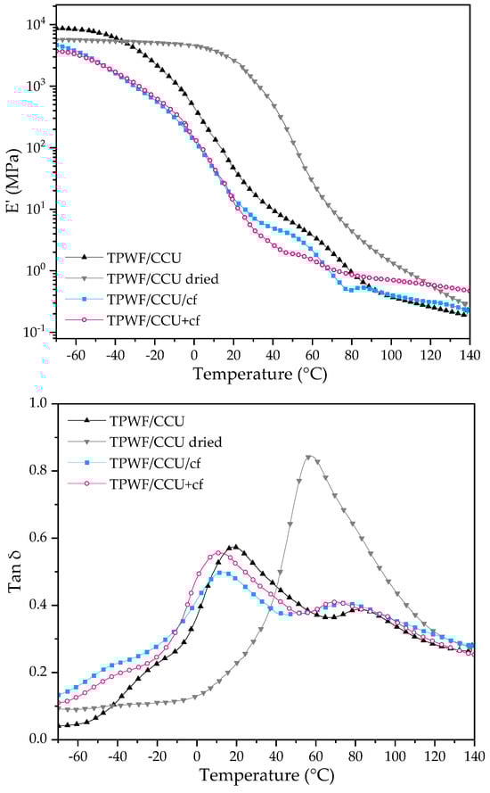 The DMTA results (the storage modulus—E′ and tan δ curves) are presented in Figure 2. To confirm an interpretation of the tan δ results, dried TPWF/CCU was added. For the conditioned films, E’ rapidly decreased with the temperature increase, and the values were low at elevated temperatures, which indicates their thermo-processable features [49,61,62,63]. Only for the dried sample was a pronounced drop of the parameter visible (at ca. 18 °C). This sample was quite brittle, indicating the key role of moisture or water (acting as the co-plasticizer) in the mechanical and viscoelastic properties of the biocomposites modified with hygroscopic DES. There are differences in TPWF/CCU and the composites. For the sample without the filler, E’ is lower than TPS with the filler at ca. 80 °C. Similar results were obtained in our previous work for TPS with DES betaine:urea 1:5 [49]. When comparing storage moduli at higher temperatures for composites, a difference between TPWF/CCU/cf and TPWF/CCU+cf can be noticed. As for TPS/DES/cf [49], it can indicate that CCU+cf premixtures form stronger bonds between DES and cf by partial extraction of compounds from the filler.