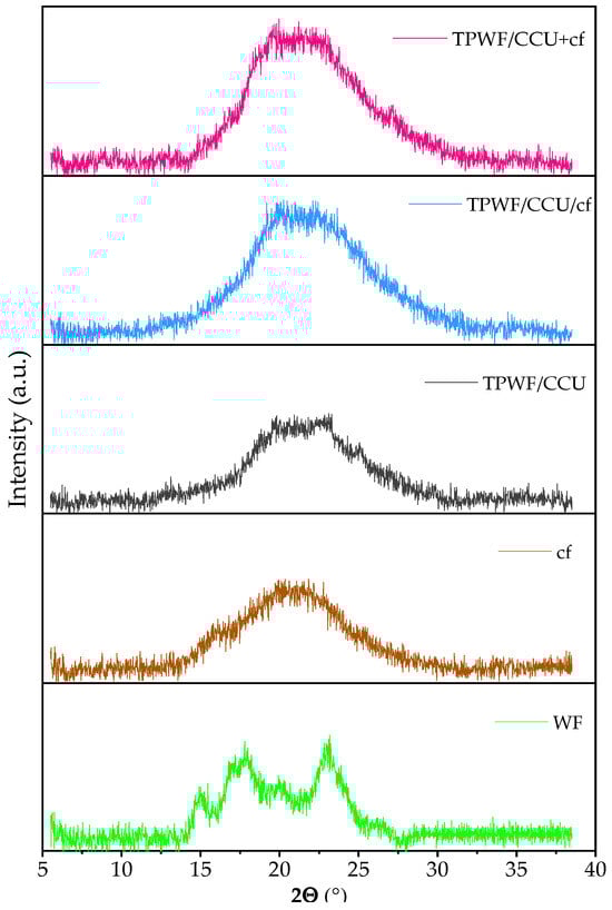 XRD pattern for native wheat flour (WF), spent coffee grounds (cf), thermoplasticized TPWF with CCU 1:5 and its biocomposites (TPWF/CCU/cf and TPWF/CCU+cf).