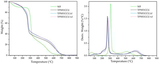 TGA results for native wheat flour (WF), thermoplasticized WF with DES (TPWF/CCU), and TPWF with spent coffee grounds (TPWF/CCU/cf and TPWF/CCU+cf).