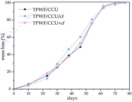 The compostability and biodegradability degree of TPWF films were determined under controlled composting conditions using the methodology presented in the standard PN-EN 14046 [54]. The method was modified, as due to a release of ammonia during the test, the measurement of CO2 failed. The tested films were cut into smaller fragments (approx. 225 mm2). Then, the pieces were mixed in a ratio of 6:1 with the compost and incubated at a temperature of 25 ± 2 °C. The vessel was refilled with ¾ of a mixture to allow aeration with handshaking. The humidity of the compost was 55% ± 2 °C and pH = 7.3. In the following part of the study, the weight loss of the materials was measured.