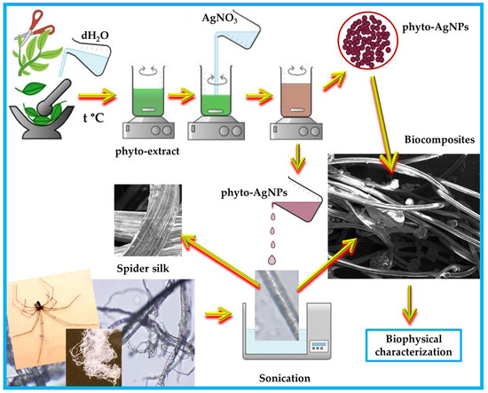 As it is known, biocomposites combine the properties of all their components. In this regard, taking into account the properties of phyto-AgNPs and spider webs, the current study proposes the functionalization of spider webs (arising from the spider Pholcus phalangioides) with phyto-AgNPs obtained from Andropogon halepensis, as mentioned above.