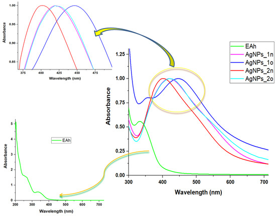 As observed, the shape of the FTIR ATR spectra of the silver nanoparticles obtained through bio-reaction (1)—AgNPs_1n and AgNPs_1o—closely resembled the spectrum of the phyto-extract EAh, while the FTIR ATR spectra of the silver nanoparticles obtained through bio-reaction (2)—AgNPs_2n and AgNPs_2o—were much different from those of the samples previously mentioned.
