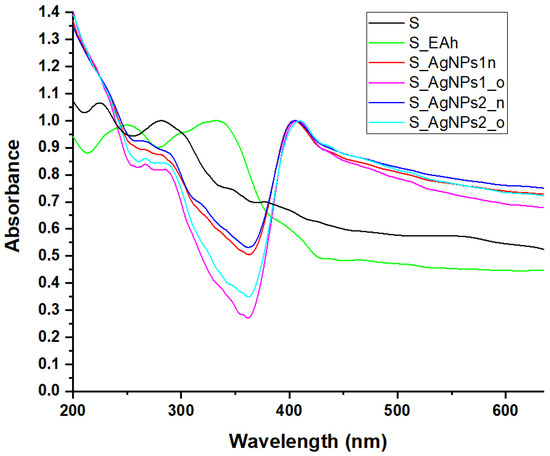 Comparative presentation of UV-Vis absorption spectra of the spider silk samples untreated (S) and treated with plant extract (S_EAh) or with silver nanoparticles obtained by Bio-Reaction 1 (S_AgNPs_1n and S_AgNPs_1o) and Bio-Reaction 2 (S_AgNPs_2n and S_AgNPs_2o).