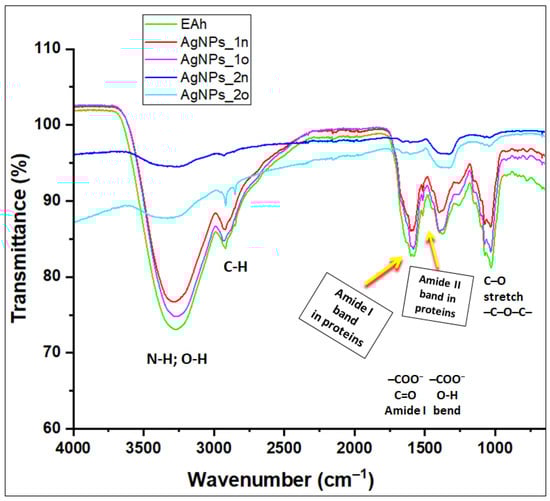 In the fingerprint region, the narrow and medium band at 1369 cm−1 (assigned to carboxylates; phenol or tertiary alcohol, O–H bend; primary or secondary, O–H in-plan bend; C–H bend) in the EAh spectrum was weakened after the addition of silver nitrate and shifted to 1398 cm−1 in the AgNPs_1n spectrum and to 1354 cm−1 in the AgNPs_2n spectrum. Moreover, this band broadened in the case of AgNPs_2n.