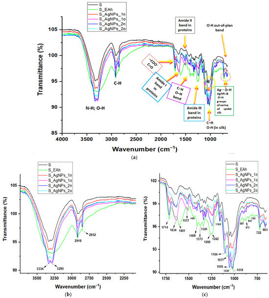 Comparative presentation of FTIR ATR spectra of the spider silk samples untreated (S) and treated with plant extract (S_EAh) or with silver nanoparticles obtained by Bio-Reaction 1 (S_AgNPs_1n and S_AgNPs_1o) and Bio-Reaction 2 (S_AgNPs_2n and S_AgNPs_2o) (a). Insets show the magnified regions of the FTIR ATR spectra of the biocomposites (b,c).