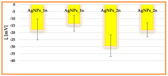 Zeta potential measurements revealed the negative charges of the phyto-nanometallic particles due to the presence of carboxylate and hydroxyl groups on their surfaces, arising from proteins and polyphenols, respectively (as demonstrated by UV-Vis and FTIR ATR spectroscopy). Figure 6 displays a comparative presentation of the zeta potential values for the Andropogon-derived AgNPs. The particles AgNPs_2 were more stable than AgNPs_1, since they had a more negative value for the zeta potential; therefore, electrostatic repulsion was more pronounced in this case. AgNPs_1n presented a moderate physical stability (ξ = −17.7 ± 7.41 mV), while AgNPs_2n showed a good stability (ξ = −29.3 ± 7.70 mV). These values obtained for our developed AgNPs are in line with other reports in the scientific literature. For instance, Vishwasrao et al. prepared AgNPs from sapota (Manilkara zapota) pomace extract, with a moderate stability (ξ = −13.41 ± 0.02 mV) [46]. Malaka et al. [47] synthesized AgNPs from Zea mays husk extract, with a zeta potential value of −28.7 mV.