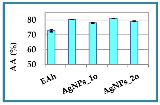 The in vitro antioxidant activity of the A. halepensis extract and the derived phyto-metallic particles was evaluated using the chemiluminescence technique. The AA% values varied in the range 74–81%, and the results are displayed in Figure 9. The ability of the Andropogon extract to scavenge free radicals was due to the presence of bioactive molecules such as polyphenols and flavonoids (see Section 3.1 and Section 3.2). The good antioxidant properties of the developed AgNPs were retained even after 18 months. Only slight changes in the antioxidant activity values occurred.