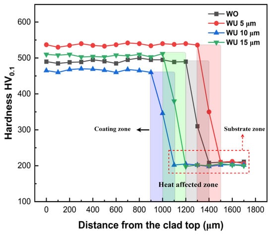 Cross-sectional microhardness profile of HEA R-UVALC coating along the distance from the clad top, without ultrasonic vibration and with ultrasonic vibration amplitudes of 5–15 µm.