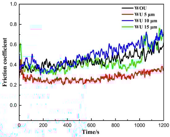 Friction coefficient pattern of HEA R-UVALC coating at ambient temperature with an interval of 1200 s, without ultrasonic vibration and with ultrasonic vibration amplitudes of 5, 10, and 15 µm.