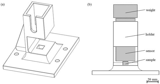 Custom-built holder for sensor (a) and the entire measurement setup applied (b).