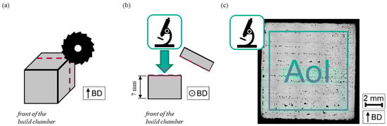 Schematic illustrating the main steps of the porosity assessment. First, a 3 mm thick plate is cut from the sample (a). Afterward the resulting cross-section is polished and images are taken using a microscope (b). The images are stitched together so that an overview image of the whole sample is obtained. From this overview image, the AoI is taken to determine the porosity of the sample (c).
