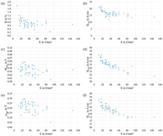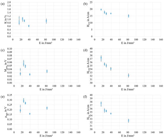 Results of the micromagnetic variables (a), (b), (c), (d), (e), and (f) as a function of the energy density used during PBF-LB/M. The data shown represent the arithmetic mean of 100 measurements. For better readability, only a part of the y-axis in (d,f) is shown.