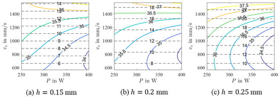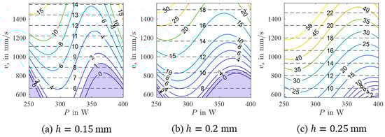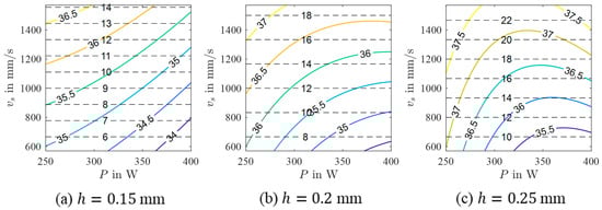 In order to derive possible relations between the process parameters , , and and the micromagnetic variables, a mathematical model was calculated for every considered micromagnetic variable. As can be seen from the results presented in Table 3, performance criteria vary significantly. Especially, the models of and show poor values. In contrast, and reveal high values and relatively low values. According to these results, it can be concluded that these micromagnetic variables have the potential to be correlated with the porosity of the PBL-LB/M-manufactured 42CrMo4 samples. As a consequence, the resulting models are assessed in more detail as follows. For both models, the selected model terms are summarized in Table 4. In addition, contour plots in the - space obtained for different are shown in Figure 5 and Figure 6. Although the contour plots of and vary in specific details, their general appearance is similar. For both micromagnetic variables, the values decrease from high () and high in combination with low (), respectively, to high and low independent of . Accordingly, areas with low values, e.g., A/cm, are seen at high and low . These areas decrease in size with increasing . Moreover, the areas are shifted to higher and lower with increasing values.