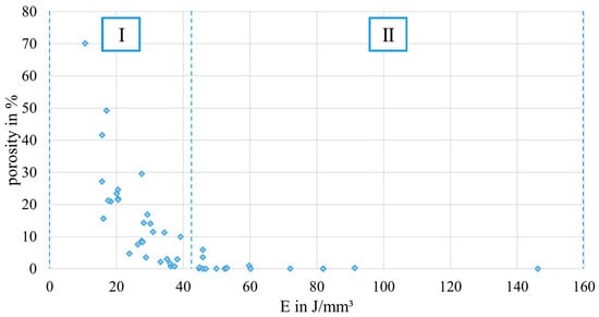 Evolution of porosity as a function of energy density. The graph can be divided into two areas, i.e., high porosity (area I) and low porosity (area II).