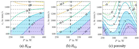 To investigate the possible correlations of the micromagnetic variables and the porosity, the contour plots of and (cf. Figure 5 and Figure 6) are compared to the contour plot of the porosity (cf. Figure 8) as exemplary shown in Figure 9 for mm. The contour plots of , and show areas of low values at high and low . In the same parameter range, an area with low porosity values exists. Moreover, the areas with low , and porosity values get smaller and are shifted to higher and lower with increasing . Despite these promising similarities (in terms of qualitative assessment), the contour maps indeed vary in a lot of details. This is attributed to the fact that different terms were selected in the underlying models. Moreover, a number of uncertainties in the used data set could negatively influence the modeling results, e.g., the high number of samples with stripe pores considered in the modeling task of porosity and the non-optimal measurement setup used for the micromagnetic measurements due to the not closed magnetic circuit. Nevertheless, the similarities between the contour plots indicate a reliable correlation between and the porosity as well as and the porosity. It can thus be concluded that the present feasibility study pinpoints the high potential of the 3MA-II device as a downstream NDT quality inspection system for the rapid screening of PBF-LB/M-processed components. However, further detailed investigations are required. In follow-up studies, different modeling approaches have to be investigated for both micromagnetic variables and for a combination of them. Moreover, additional micromagnetic variables should be related to the porosity to eventually improve the reliability of the results obtained.