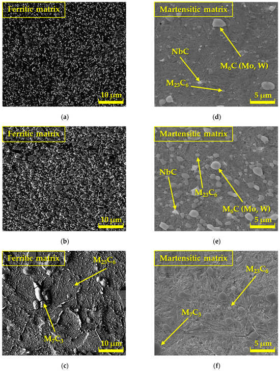 The illustrations (Figure 1a–c) interpret the microstructures of ASP2017, ASP2055, and X153CrMoV12 steels, which were supplied in the basic soft annealed state. The structure in Figure 1a is formed by larger primary carbides and smaller secondary carbides that were formed during annealing. The carbides are regularly distributed in the ferritic matrix. The structure shown in Figure 1b also defines steel with uniformly distributed carbides in the ferritic matrix, which occur in increased quantities since this material contains a larger amount of carbide-forming elements based on Cr, W, V, Mo, as well as Nb. The third type of structure (Figure 1c) indicates the basic microstructure of X153CrMoV12 steel, which in the basic state was formed by a ferritic matrix with the occurrence of large primary carbides M7C3 and small secondary carbides M23C6. Secondary carbides were formed as a result of precipitation during steel annealing. The remaining illustrations (Figure 1d–f) represent the microstructures after the final heat treatment (Q + T). The structure in Figure 1d, steel ASP2017, is formed by larger primary carbides based on Mo and W and smaller secondary carbides based on Cr, which were formed during the tempering process. Nb-based carbides are dimensionally larger than ASP2017 steel [20]. Carbides are regularly distributed in the matrix of tempered martensite. The microstructure of ASP2055 steel (Figure 1e) is very similar to ASP2017 steel, also with uniformly distributed carbides in the matrix of tempered martensite, with the difference that these carbides reach larger dimensions. The structure (Figure 1f) of X153CrMoV12 steel is formed by prominent primary carbides and smaller secondary carbides. Secondary carbides were formed as a result of precipitation during the tempering of steel. Carbides are also regularly distributed in the matrix of tempered martensite.