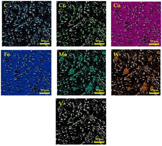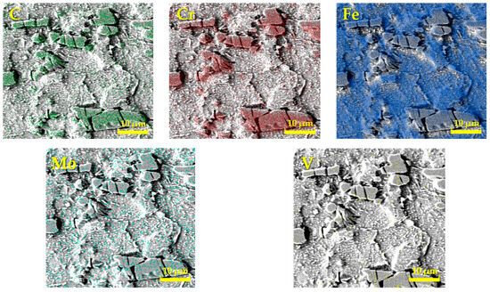 For a more detailed study of the structure of all experimental steels, a chemical analysis was also carried out in the presented studies by means of EDS on a Tescan Vega 3 electron microscope, which was localized only to specific chemical elements [21,22]. The measurements were focused mainly on carbide particles, and thus, the results do not correspond to the results of the spectral analysis, as carbides have a different chemical composition and lattice. Figure 2, Figure 3 and Figure 4 interpret the distribution of individual chemical elements for all investigated steels through EDS analysis, which is expressed by the color scale [23].