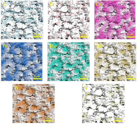 The resulting values of the chemical composition of these steels through EDS analysis are clearly documented in Table 2. The EDS analysis of ASP2017 steel shows that large primary carbides are mainly composed of W and Mo. Fe is mainly concentrated in the matrix. For ASP2055 steel, the results of the analysis were similar to the previous case. This steel contains a larger amount of Nb, which is more pronounced in the composition of primary carbides [20]. In the chemical composition of the steel X153CrMoV12, the main alloy C dominates, the occurrence of which is mainly concentrated in large primary carbides M7C3 [24]. Fe is again mainly concentrated in the matrix. Other elements are represented in a minority, and their color distribution within the EDS analysis is difficult to see.