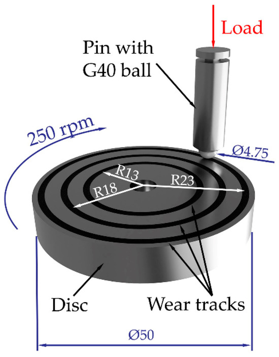 The tribological experiment was carried out on a UMT TriboLab tribological tester from Bruker. As part of the experimental testing, the tribological method of the ball-on-disc type was applied, which is one of the most used methods in the field of tribology, serving not only to measure COF but very often it is also possible to encounter it when evaluating the resistance of individual materials to wear [26,27,28]. The method used is suitable for investigating the properties of various materials, including metals, polymers, ceramics, composites, and other types of materials. A sample of the experimental sample after tribological testing and its dimensions are clearly shown in Figure 5. A hardened steel ball made of material G40 with a diameter of 4.76 mm was chosen as the counterpart contact. Subsequently, three types of loads were chosen—10 N, 6 N, and 2 N, as well as three types of turning radii—13 mm, 18 mm, and 23 mm, which represent a peripheral speed of 0.34, 0.47, and 0.60 m/s. All tribological measurements were carried out according to the valid ASTM G99 standard [29] at room temperature without the application of lubricating liquid to accelerate the degradation of the material. The measurement duration for each experimental sample was 20 min. The rotation speed was set to 250 rpm. COF values and wear of individual types of materials were measured and evaluated in relation to HT (Q + T), applied load, and turning radius.