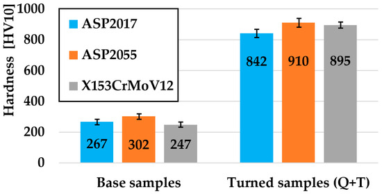 As part of the experiment, hardness measurements of all investigated materials ASP2017, ASP2055, and X153CrMoV12 were also made, performed on samples in the basic state, and turned Q + T samples. The hardness of the selected samples was measured at five independent locations, from which the average value for a specific type of test sample was calculated. As part of the hardness measurement, the Qpix T2 software version 3.1.0.4 was used, which was part of the equipment of the QATM hardness tester. As part of hardness testing, the Vickers-type method was applied with a load of 10 kg (HV10). The standard STN EN ISO 6507-1 (420374) [20,25] was used for hardness testing.