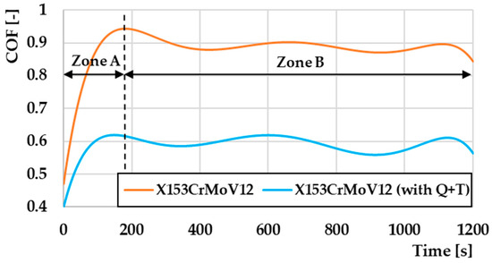 An example of the comparison shown in Figure 7 shows the measured COF curves for the material X153CrMoV12, turning radius 23 mm, load 10 N. Two zones can be observed in this illustration. Zone A represents the start-up part of the curve, where a friction groove begins to be generated on the surface of the examined material within 180 s. Zone B already defines the steady part of the curve. It is also possible to see that the highest COF value within the “Ball-on-Disc” method was achieved at the interface of both zones for both types of samples. Subsequently, the COF value stabilized and began to show regular fluctuations in values. This oscillation of values is caused by the accumulation and release of these microparticles of material in front of the counterpart. This material creates resistance during friction, which is subsequently released, and the COF value decreases. During this process, two ways of its movement occur: the first part of the material moves to the edge parts of the friction track, which is also affected by the centrifugal force during the experimental testing, and the second part of the material is pushed into the surface of the friction track by a counterpart in the form of a ball from which later become abrasive particles. These particles are exposed to a large plastic deformation during the friction process, which also increases their hardness and strength, which affects the increase in the wear value of the material [36,37].