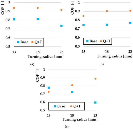 Comparison of COF by turning radius at 10 N: (a) ASP2017; (b) ASP2055; (c) X153CrMoV12.