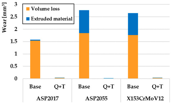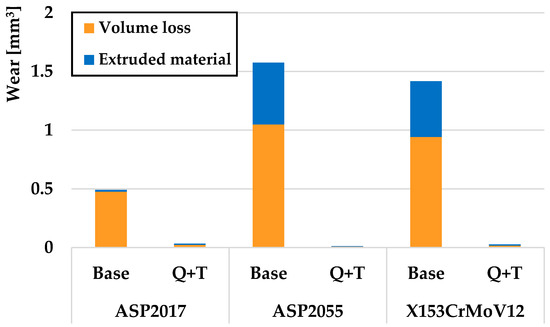 A comparison of the wear of all investigated steels for a turning radius of 13 mm, where there was a significant difference between the samples that underwent the Q + T process and the samples that were not subjected to Q + T, is shown in Figure 9. The resulting wear value is, therefore, cumulative, i.e., the volumes of removed and extruded material make up the total wear of the samples. The orange color on the graph indicates the volume of material that has been removed, while the blue color indicates the plastically deformed material that has pushed out the sides of the friction track. For samples without final Q + T, it was seen that the lowest wear value was achieved by the ASP2017 material, which also showed the lowest amount of extruded material on the sides of the friction groove. The highest value recorded was by the ASP2055 material. This material also showed the largest percentage difference in wear rate. Figure 10 shows a comparison of the wear of all the investigated steels for a turning radius of 18 mm, where a significant wear difference was observed between Q + T samples and base samples. Similar to the previous material, a similar ratio of wear values was observed, with the lowest wear observed on the ASP2055 material after Q + T. Of the samples that did not go through the Q + T process, the ASP2017 material again showed the least amount of wear.