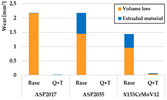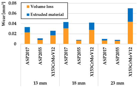 In contrast to the previous two turning radii, different wear values were obtained for base samples for a turning radius of 23 mm (Figure 11). The ASP2017 material achieved the greatest wear in the given samples. Also, as in previous cases, this material showed only a minimal volume of printed material. The lowest wear was achieved by the material X153CrMoV12, which, when compared to the material ASP2017, achieved approximately 50% wear. The same result was achieved for the samples that went through the final Q + T process as for the other turning radii. From these results, the ASP2055 material again showed the lowest wear rate.