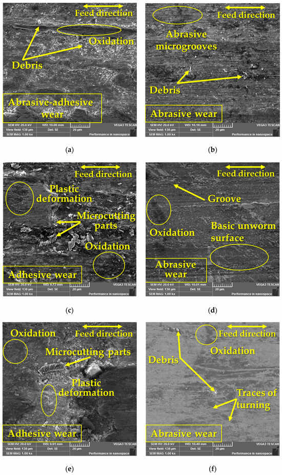 Wear analysis of the surfaces of the investigated materials at a radius of 23 mm: (a) ASP2017 base material; (b) ASP2017 with Q + T; (c) ASP2055 base material; (d) ASP2055 with Q + T; (e) X153CrMoV12 base material; (f) X153CrMoV12 with Q + T.