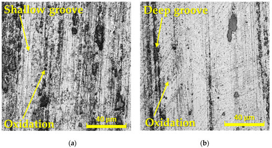 When comparing base samples (Figure 13a,c,e), a different surface morphology was seen, which mainly showed only adhesive wear. Since these materials had significantly lower hardness, significant plastic deformation in the friction grooves could therefore occur. In this case too, the deposit of an oxidation layer was detected, but to a much greater extent. In Figure 13a, a mixed type of wear, i.e., abrasive–adhesive, was evaluated, while the abrasive wear was much smaller. During adhesive wear, there was a formation of microdeposits between the contact pair of materials (ball + experimental sample), which caused a constant change in the roughness of both surfaces and thus led to the occurrence of plastic deformation. The occurrence of plastic deformation was also caused by the state of hardness, while it is generally true that the proportion of plastic deformation in the friction process increases with decreasing hardness [43,44].