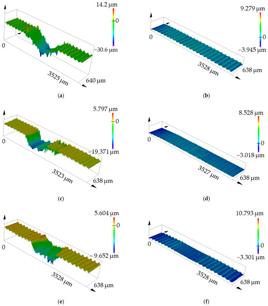 Figure 15a,c,e show the 3D groove profile without Q + T, where significant wear can be clearly observed within all types of experimental tool steels. There is also slightly detectable plastic deformation in the form of printed material along the edges of the friction grooves. On the test samples, when examining specimens ASP2017 and ASP2055 (Figure 15b,d), it was notably challenging to identify the friction groove in comparison to the remaining specimens. This observation strongly suggests that these materials exhibit an exceptionally low total wear rate following the Q + T process. On the X153CrMoV12 sample (Figure 15f), it was possible to optically detect a slightly higher wear value than in the previous samples. All these results were closely related to the wear comparison in Figure 11.