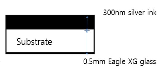 Table 1 shows detailed information about the ink. The substrate used in the experiment was Eagle-XG glass (Corning, Corning, NY, USA) with dimensions of 24 × 24 × 0.5 mm3 (width × height × thickness). The substrates were immersed in ultrasonic cleaning for 10 min with acetone, and another 10 min in isopropyl alcohol (IPA). After the ultrasonic cleaning, the substrate was heated in an oven at 100 °C for 10 min for baking. The Ag NP ink was spin-coated on the dried substrate with an average layer thickness of 300 nm. The thickness of the spin-coated sample had some minor variations, as was the case in our previous study.