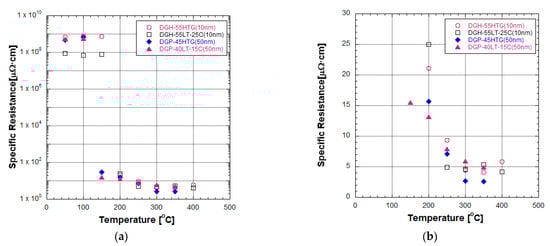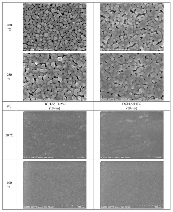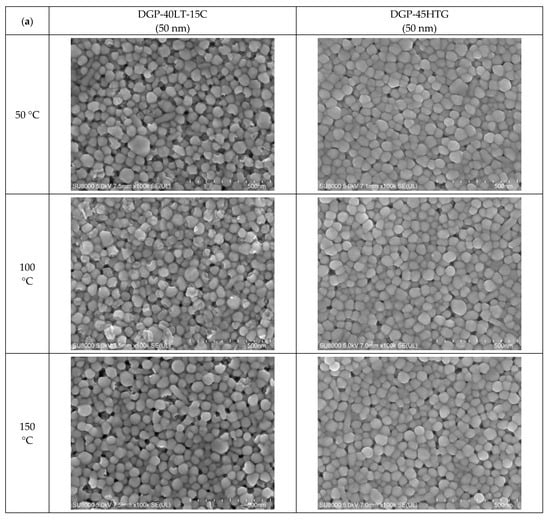Figure 2 presents the specific resistance of two different particle size inks after furnace sintering at various temperatures. At low sintering temperatures, the reduction in specific resistance by the increase in sintering temperature was obvious but the specific resistance values remained around the order of 1 to 10 Ω∙m. The specific resistance of DGH-55LT-25C remained a little below 1 Ω∙m. Other Ag NP inks remained a little below 10 Ω∙m. In contrast, the specific resistance of the inks experienced a drastic decrease when the sintering temperature exceeded a certain temperature. In the case of 50 nm inks, this specific resistance drop happened when the sintering temperature increased from 100 °C to 150 °C. The specific resistance of DGP-45HTG dropped from 6.7817 Ω∙m to 30.4 μΩ∙cm, and the specific resistance of DGP-40LT-15C dropped from 5.5911 Ω∙m to 15.4 μΩ∙cm. In the case of 10 nm inks, this specific resistance drop happened when the sintering temperature increased from 150 to 200 °C. The specific resistance of DGH-55HTG dropped from 7.33 Ω∙m to 21.0 μΩ∙cm, and the specific resistance of DGH-55LT-25C dropped from 0.78 Ω∙m to 25.0 μΩ∙cm. Figure 2b shows the linear scale graph of the specific resistance of the inks sintered at temperatures from 200 to 400 °C. We can see from Figure 2b that the decrease rate of specific resistance declined as the sintering temperature increased. After the drastic decrease in specific resistance, the specific resistance of all types of Ag NP inks maintained a decreasing trend until 250 °C. After that, the specific resistance of DGH-55LT-25C remained stable from 250 to 400 °C. The specific resistance of DGH-55HTG decreased until 350 °C but increased at the sintering temperature of 400 °C. The specific resistance of 50 nm inks maintained a decreasing trend until 350 °C, while the specific resistance values corresponding to the sintering temperature of 400 °C was not observable. The lowest specific resistance obtained from this experiment was 2.6 μΩ∙cm in the case of 50 nm ink sintered under 350 °C; this value is about 1.6 times the bulk silver specific resistance of 1.6 μΩ∙cm.