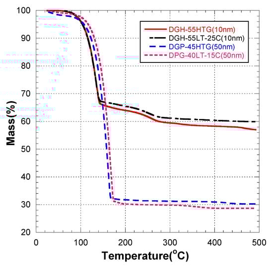 The comparison of the sintering behavior of four kinds of Ag NP inks (ANP Inc., Sejong, Republic of Korea) was carried out. Among them, two kinds of inks had an average particle size of 50 nm, and the other two kinds of inks had an average particle size of 10 nm. The 50 nm inks were commercial inks named DGP-45HTG (400 °C) and DGP-40LT-15C (150 °C), and the 10 nm inks were commercial inks named DGH-55HTG (400 °C) and DGH-55LT-25C (250 °C). The recommended curing temperatures by the manufacturer are presented in parentheses. The dispersant used in the 50 nm inks was triethylene glycol monoethyl ether (TGME), while the 10 nm inks used tetradecane.