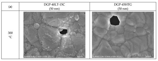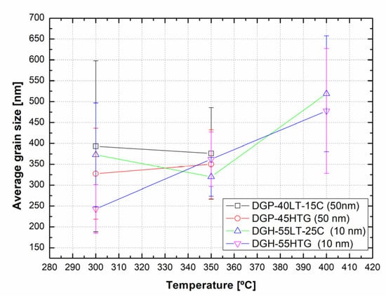 Figure 6 presents the grain sizes of the 50 and 10 nm-sized Ag NP sintered at 300 °C and above, based on the FESEM images. Figure 6a shows the 50 nm Ag NP with sintering temperatures of 300 and 350 °C. The size of each grain was measured and labeled using an image processing tool. The averages of grain size of DGP-40LT-15C sintered at 300 and 350 °C were 393.25 and 376.26 nm, respectively. The averages of grain size of DGP-45HTG sintered at 300 and 350 °C were 327.46 and 349.99 nm, respectively. The grain size of the two inks varied with respect to the sintering temperature. It was also noticeable that the standard deviations (SDs) of the grain size decreased for both inks. The SDs of grain size of DGP-40LT-15C sintered at 300 and 350 °C were 219.01 and 115.01 nm, respectively. The SDs of grain size of DGP-45HTG sintered at 300 and 350 °C were 113.89 and 87.32 nm, respectively. This indicates that the smaller grains have grown, and the particles became similar in size. The grain size measurements in Figure 6a indicate that the decrease in specific resistance of 50 nm Ag NP is related to the increase in grain size of the Ag NP. However, the changes in the specific resistance and the grain size were both relatively insignificant compared to the changes in the sintering temperature range of 50 to 300 °C. Figure 6b shows the grain size of the 10 nm NP with sintering temperatures 300, 350, and 400 °C. Figure 7 is the graph of the average grain size with respect to the temperatures from 300 to 400 °C. The averages of grain size of DGH-55LT-25C sintered at 300, 350, and 400 °C were 372.76, 320.13, and 519.04 nm, respectively. The SDs of grain size of DGH-55LT-25C sintered at 300, 350, and 400 °C were 132.78, 49.38, and 154.92 nm, respectively. The averages of grain size of DGH-55HTG sintered at 300, 350, and 400 °C were 243.17, 362.28, and 477.92 nm, respectively. The SDs of grain size of DGH-55HTG sintered at 300, 350, and 400 °C were 60.15, 70.54, and 167.08 nm, respectively. The correlation between specific resistance and grain size for 50 nm Ag NP was not noticeable for the 10 nm Ag NP. Instead, the pore size was the dominant factor for 10 nm Ag NP. At the sintering temperature of 400 °C, we can observe the drastic increase in the pore size in Figure 3 and Figure 6b. The abrupt increase in pore size does not result in a disconnection between grains but does result in a rise in specific resistance. The drastic increase in pore size restricts the paths for electron movement.