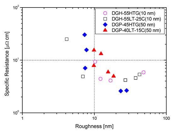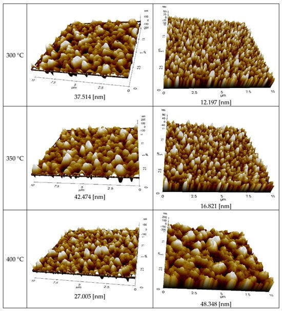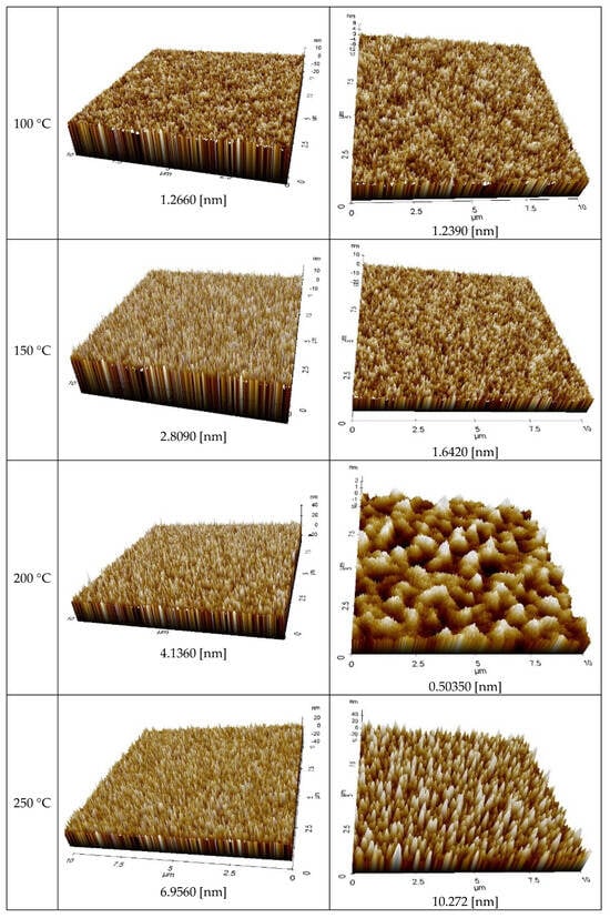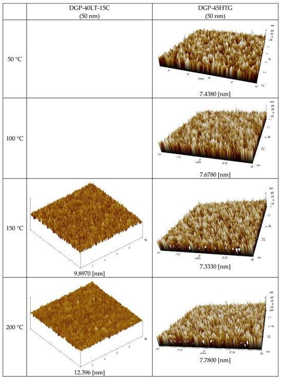 Figure 8 displays the AFM measurement results that show the roughness of the Ag NP ink with respect to sintering temperature. Generally, the roughness of the Ag NP increased as the sintering temperature increased. The FESEM images in the cases with various temperatures show that both pore size and grain size of the Ag NP ink increase as the sintering temperature increases. The excessive growth of grains could lead to increases in the roughness, and this could affect the rise in specific resistance. At lower sintering temperatures, the roughness values of Ag NP are generally below 10 nm. At lower sintering temperatures, 50 nm Ag NP had larger roughness, compared to 10 nm Ag NP, which was to be expected, due to the Ag NP size differences. The roughness of Ag NP starts to be larger than 10 nm with a sintering temperature of 300 °C or higher. The roughness values of 50 and 10 nm-sized Ag NP become similar after the sintering temperature exceeds 250 °C, but the roughness values higher than 30 nm are only observed in 10 nm Ag NP. Figure 8 shows the correlation between specific resistance and roughness for cases with electrical conductance. It can be seen from Figure 9 that when the roughness value is below 20 nm, a higher roughness generally indicates a lower specific resistance. This can be associated with grain growth. However, when the roughness value exceeds 30 nm, the relationship between specific resistance and roughness is reversed. For example, the roughness of DGH-55LT-25C follows the trend of specific resistance. The roughness was 37.514, 42.474, and 27.005 nm at 300, 350, and 400 °C; the specific resistance was 4.58, 5.34, and 4.17 μΩ∙cm at 300, 350, and 400 °C. We can see that the increase in porosity due to excessive growth of grain was reflected by both the specific resistance and the surface roughness. This shows the correlation between specific resistance and surface roughness. In other words, the increases in grain size and pore size due to grain growth influences the increase and decrease in the Ag nanoparticle ink specific resistance, and the changes in the surface roughness confirm this phenomenon.